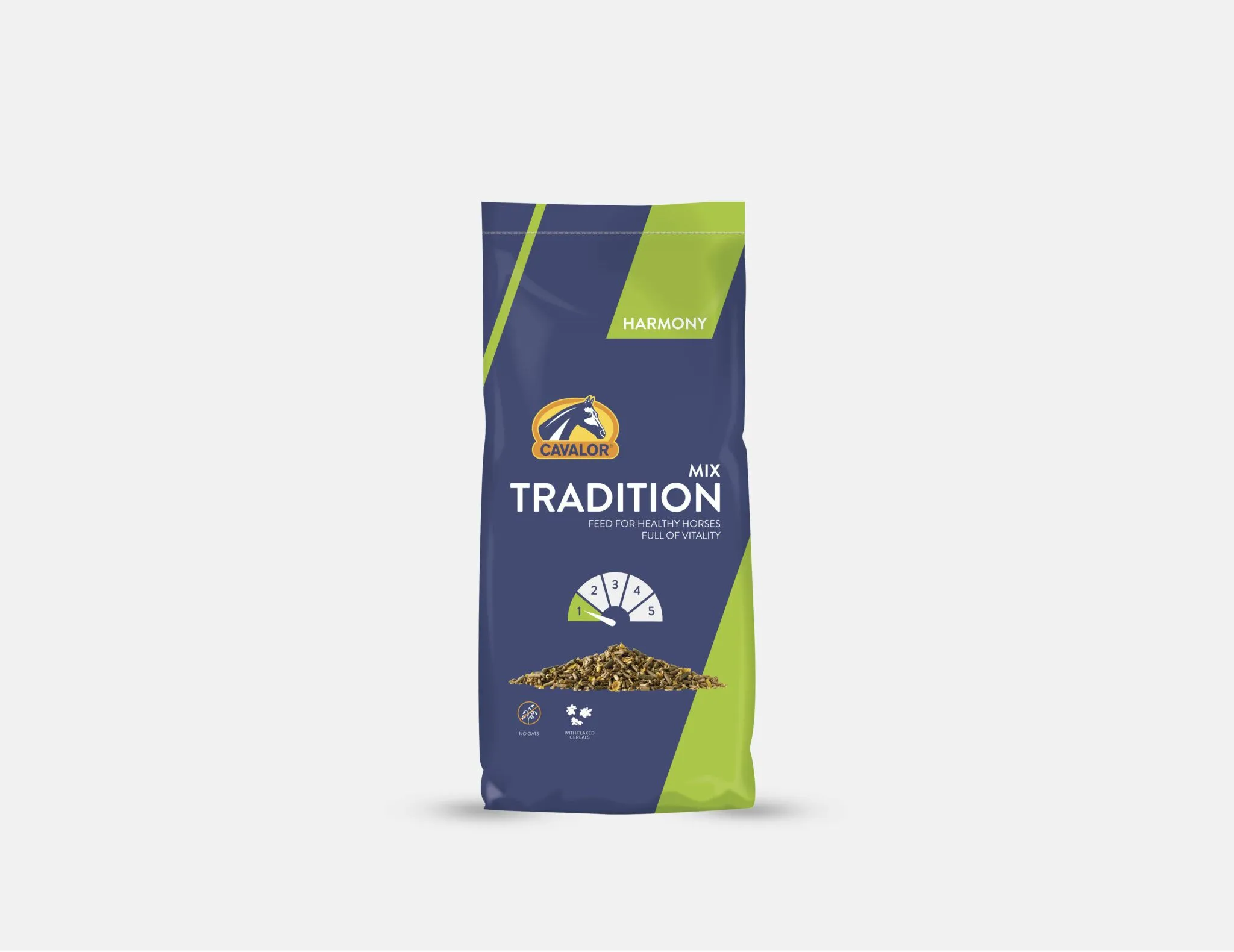 Cavalor Tradition Mix is een level 1 voer voor paarden die recreatief tot licht getraind worden of sensibele paarden.
